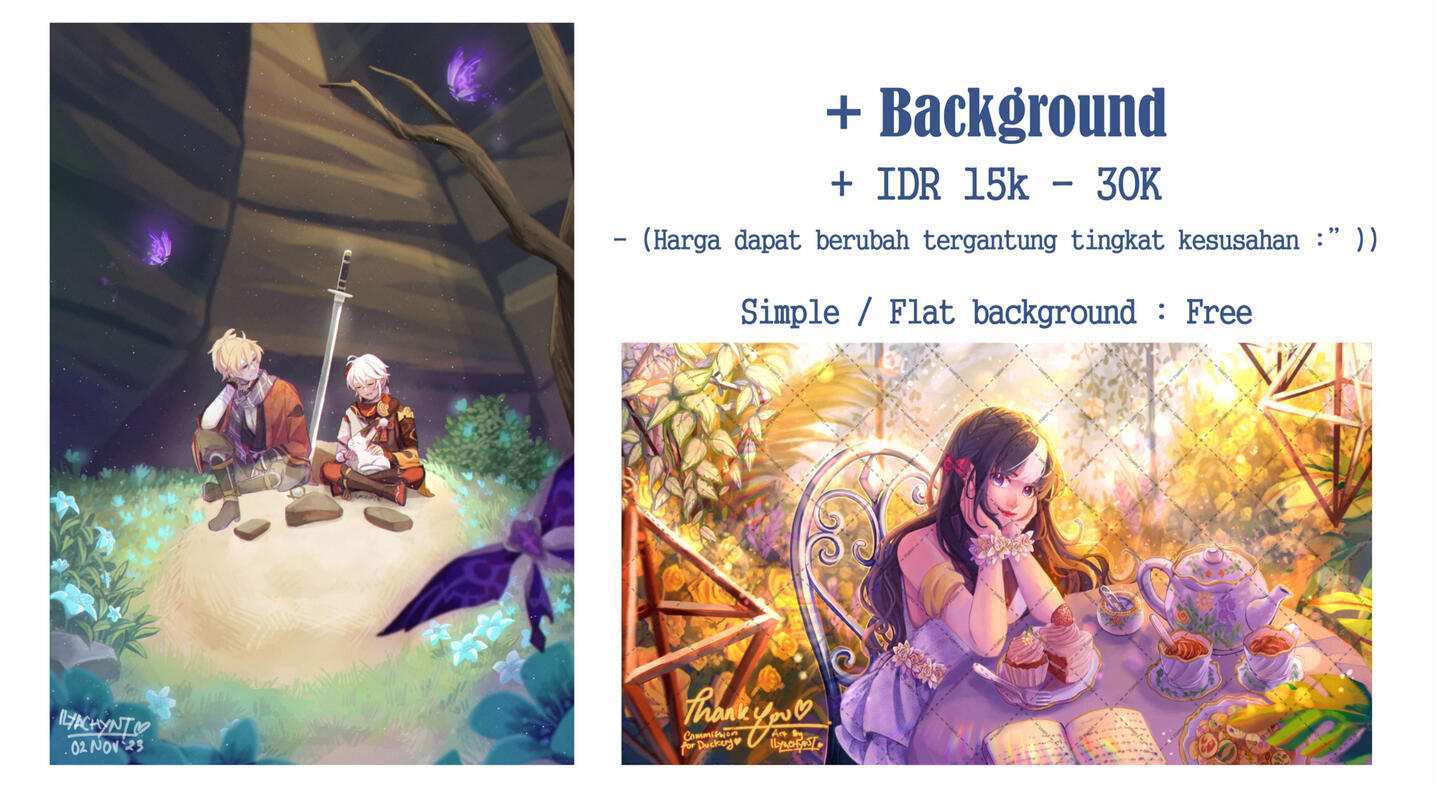 ❌Peta, Bangunan, environment4. Saya dapat menolak commission jika saya merasa tidak nyaman dengan permintaan commission atau ada halangan tertentu.5. Tolong bertanya tentang ketersediaan slot terlebih dahulu sebelum mengirimkan referensi!!6. Pembayaran HARUS dikirim setelah sketsa sudah fix (ANDA HANYA DAPAT MEREVISI GAMBAR PADA SAAT TAHAP SKETSA SAJA, JIKA GAMBAR SUDAH SELESAI/HAMPIR SELESAI SAYA HANYA AKAN MENERIMA REVISI KECIL SAJA)7. Maksimal jumlah revisi adalah 3x. Lebih dari itu akan dikenakan biaya tambahan8. HARGA DAPAT NAIK TERGANTUNG SUSAH TIDAKNYA GAMBAR YANG DIKERJAKAN!!!9. UANG TIDAK DAPAT DIKEMBALIKAN JIKA GAMBAR SUDAH DALAM PROSES PENGERJAAN10. Maksimal karakter dalam satu kanvas: 311. Tolong kirimkan referensi sejelas mungkin, dan menggunakan referensi dengan mencantumkan gambar/ referensi visual (opsional).12. ANDA AKAN MENERIMA HASIL COMMISSION BERUPA GAMBAR FORMAT JPG & PNG, dan dapat dikirim via e-mail anda atau media lain untuk menerima hasil commission.13. Pemesan dapat mengupload hasil commission (versi glazed dan watermark) dengan mencantumkan kredit. Terima kasih <314. Anda dapat menentukan deadline. jika tidak ada deadline, saya akan menyesuaikan dengan jadwal saya dan antrian.15. Deadline min. 2 minggu setelah pemesanan dan konfirmasi slot.16. Lama pengerjaan kurang lebih 1 - 3 minggu setelah sketch.17. DILARANG MENGGUNAKAN HASIL COMMISSION UNTUK AI / NFT APAPUN ALASANNYA!!!!!!